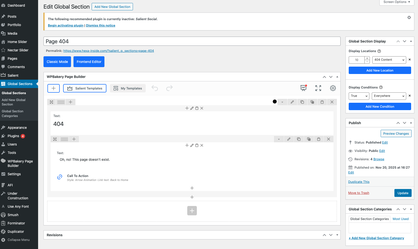 I have a question on the page 404 created in the global section of Salient: how I can put the header in transparency mode like others pages?