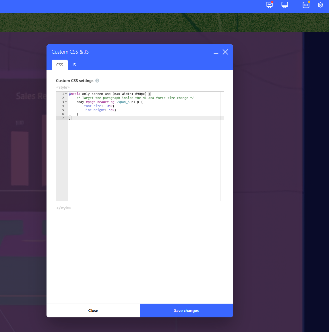 So now I've tried inserting the code in the CSS window, but it did not affect the mobile display version. On the same topic, I am trying to have a video background for the main page and control the text size for both Desktop and Mobile. So instead of having a local video, I tried having a YouTube video linked in the row settings to control the fonts of Desktop and Mobile separately, but the issue here is that the video link does not read for mobile. Can you clue me in on this? Much appreciated.